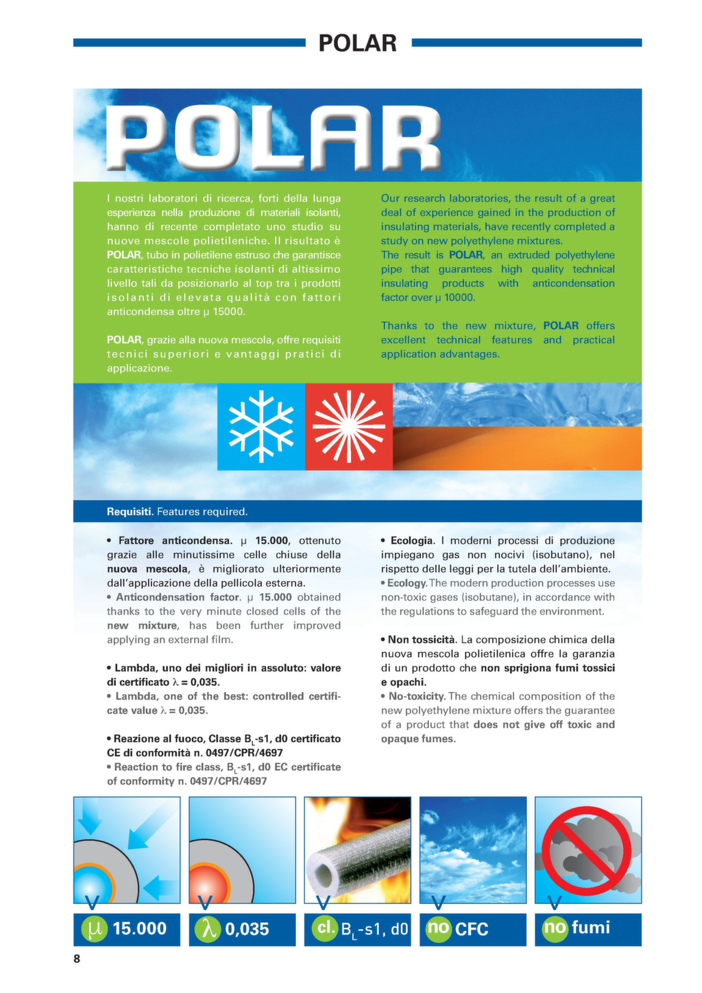 I nostri laboratori di ricerca, forti della lunga esperienza nella produzione di materiali isolanti, hanno di recente completato uno studio su nuove mescole polietileniche. Il risultato è POLAR, tubo in polietilene estruso che garantisce caratteristiche tecniche isolanti di altissimo livello tali da posizionarlo al top tra i prodotti isolanti di elevata qualità anticondensa oltre µ 15000. POLAR, grazie alla nuova mescola, offre requisiti tecnici superiori e vantaggi pratici di applicazione.
